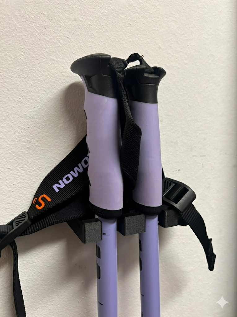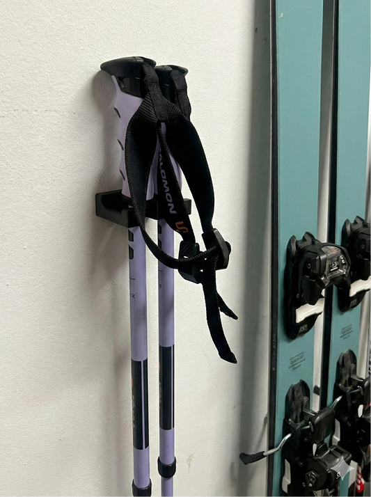 PoleGrip finns i två varianter, anpassade för både alpina stavar och längd-, skate- eller turstavar, och passar lika bra i hallen som i garage, förråd eller skidbod.